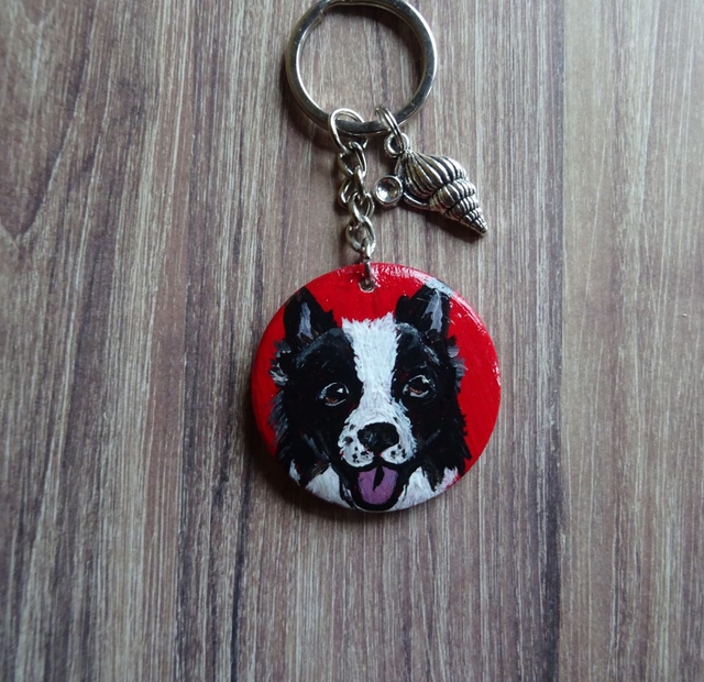 La peinture est montée à l'aide d'un anneau brisé sur un porte-clés métallique avec chaînette.